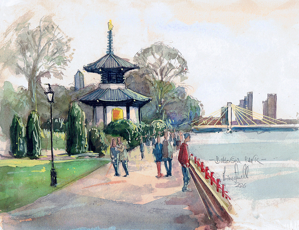 Once I had finished at the exhibition, I stepped outside to do a bit of painting, and the Pagoda in Battersea Park was ideal for a quick watercolour. No matter how cold it gets (and it was cold), looking at the Pagoda—so evocative of the tropics—makes me feel warm.
